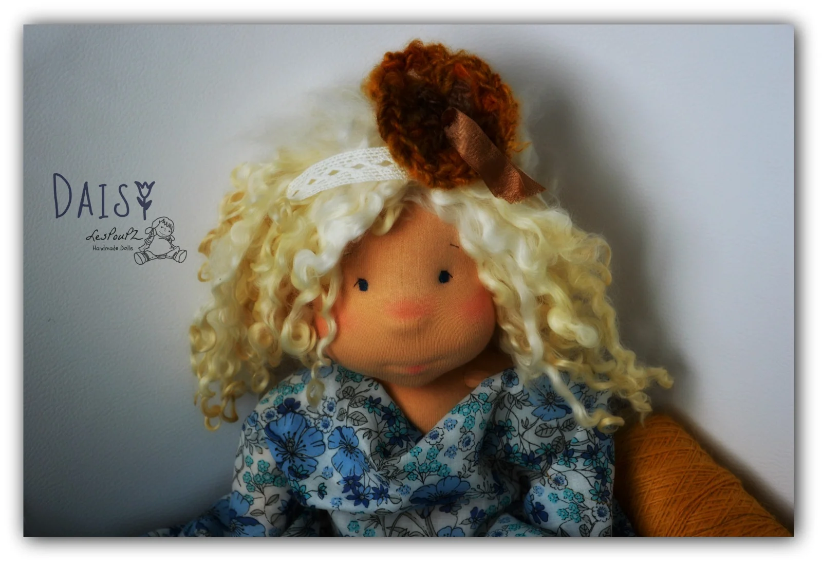 Dans le même temps, une grande sœur est née dans l'atelier, et elle est déjà heureuse de prendre soin du petit bébé. Son nom est Daisy. Elle mesure 45cm, et est réalisée sur commande. Dans le cas d'une poupée sur mesure, tout est totalement mis en place, dès le début: la couleur de ses cheveux, ses yeux, son style et sa tenue ...